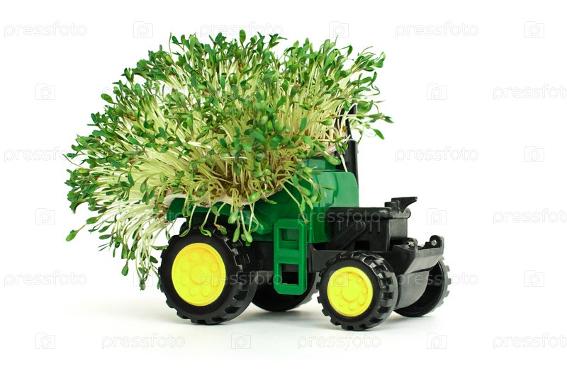 Зеленый игрушечный сельскохозяйственный трактор, сбор урожая, сельскохозяйственная техника на белом фоне место для текста, изолировать