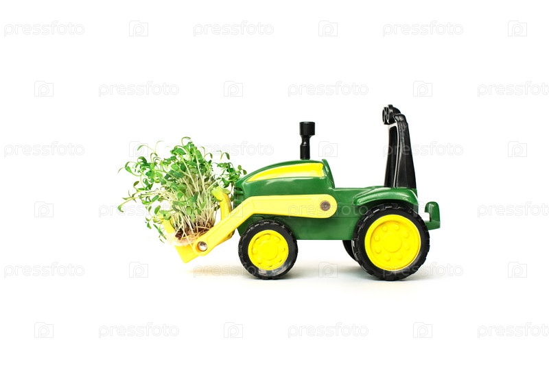 Зеленый игрушечный сельскохозяйственный трактор, сбор урожая, сельскохозяйственная техника на белом фоне место для текста, изолировать