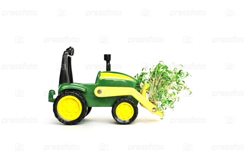 Зеленый игрушечный сельскохозяйственный трактор, сбор урожая, сельскохозяйственная техника на белом фоне место для текста, изолировать