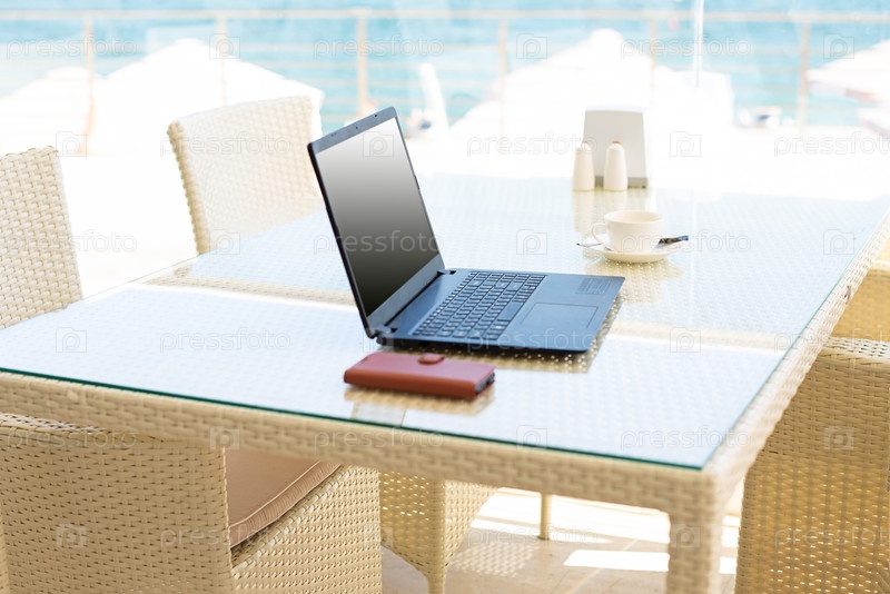 Рабочее место в кафе с видом на море. Мужчина работает за ноутбуком в кафе. Скопируйте пространство. Макет