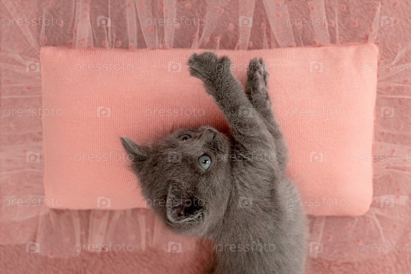 Серый котенок с когтями на розовой подушке