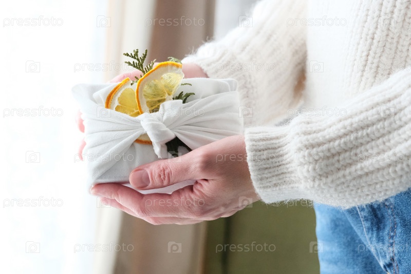 Упаковка подарков в ткань на рождество в стиле фурошики. Экологически чистая концепция. Сделай сам