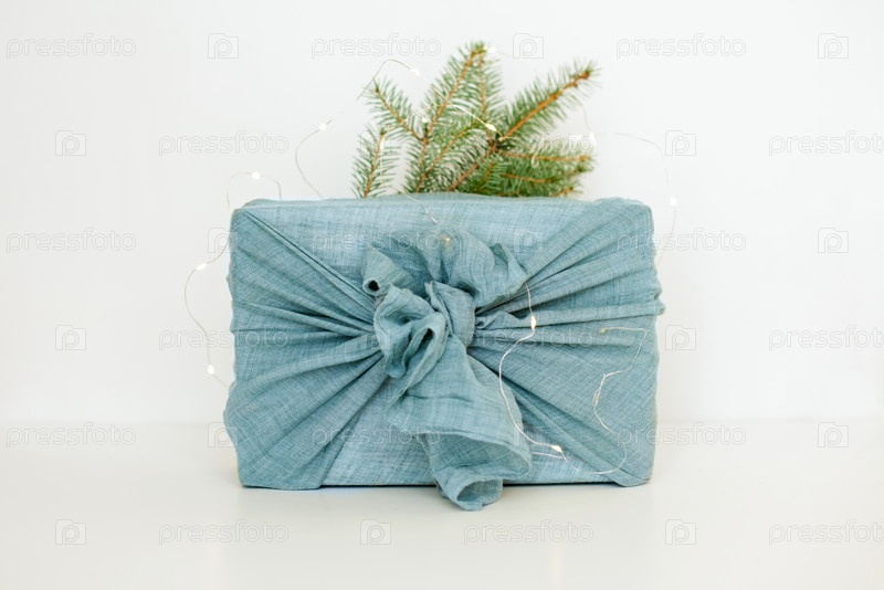 Упаковка подарков в ткань на рождество в стиле фурошики. Экологически чистая концепция. сделай сам, изолировать