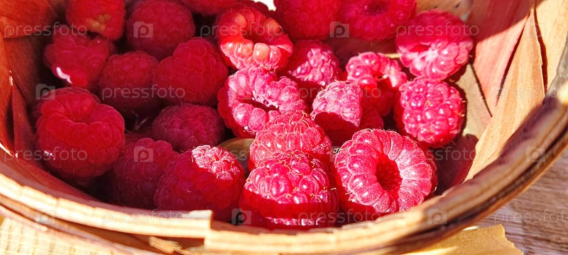 Свежая малина в корзинке из бересты. Плоды используют в пищу и для приготовления джемов, желе, соков. В народной медицине плоды и листья используют при простуде, гриппе, как жаропонижающее и потогонное средство