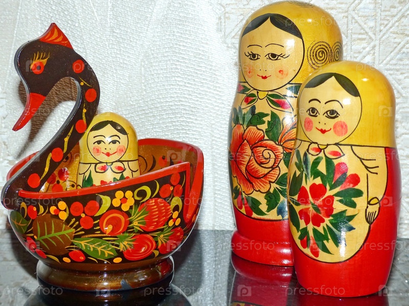 Семеновская матрешка и яркая хохломской ковш в виде птицы - традиционное русское народное творчество. Матрешка-русская складная кукла из дерева, внутри которой куклы меньшего размера