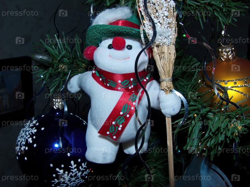 Забавный снеговик с метлой. Рождественские игрушки на рождественской елке. Праздничный фон. Новый год и Рождество