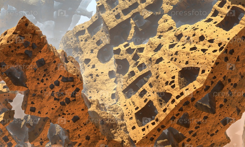 Эпическая фантастическая каменно-песчаная структура с множеством отверстий в разных плоскостях и размерах. Туманная загадочная капризная сцена. 3D вид снизу вверх. Сказочный заброшенный мир. Вдохновлен природой