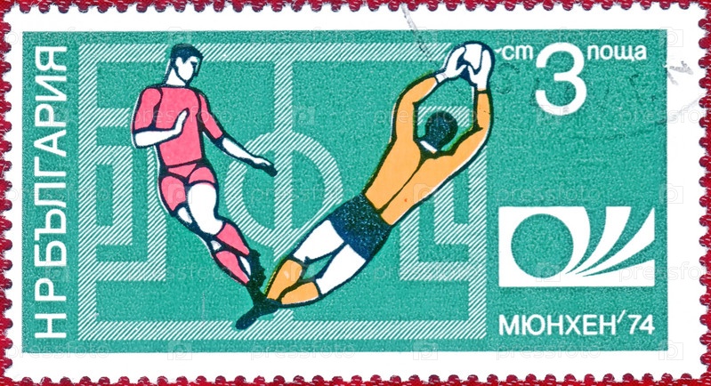 БОЛГАРИЯ - около 1974: Почтовая марка напечатана в Болгарии с изображением футболистов, с надписью "Мюнхен 74 и эмблемой чемпионата мира", из серии "Футбол"