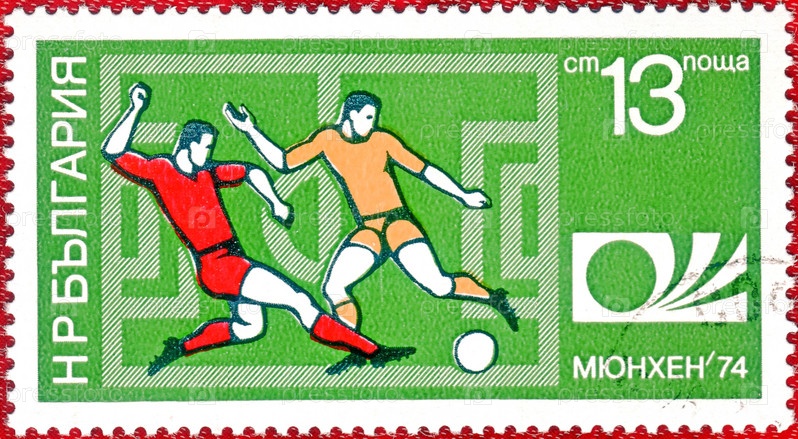 БОЛГАРИЯ - около 1974: Почтовая марка напечатана в Болгарии с изображением футболистов, с надписью "Мюнхен 74 и эмблемой чемпионата мира", из серии "Футбол"