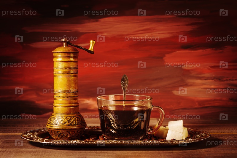 Чашка черного кофе с ручной кофемолкой, кусочками сахара и кофейными зернами на столе