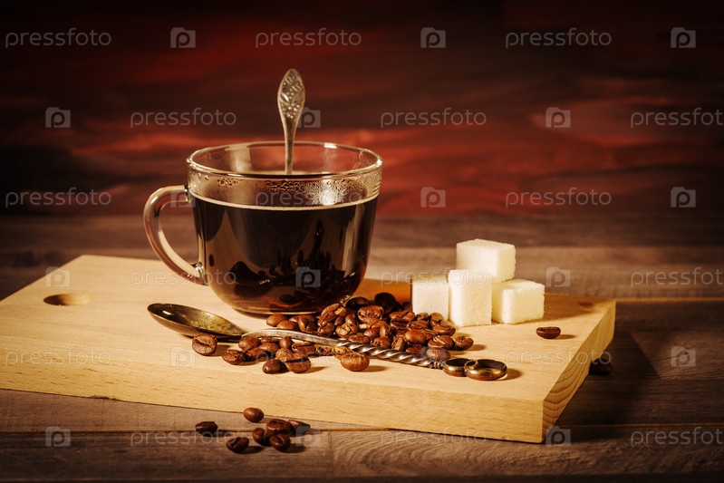 Чашка черного кофе с кусочками сахара и кофейных зерен на столе