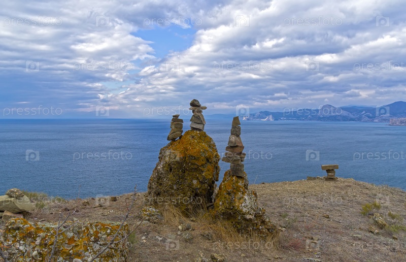 Три пирамидки, сложенные из камней, на фоне панорамы берега Черного моря. Мыс Меганом, Крым