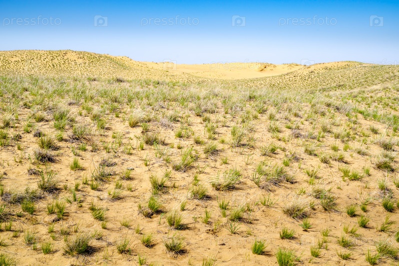 Участок весенней пустыни с песчаными дюнами и скудной растительностью