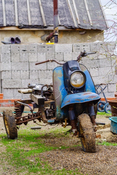 Старый сломанный трехколесный самокат во дворе сельского дома