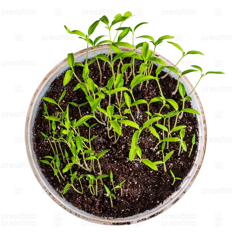 Рассада помидоров в пластиковом ведре с почвой, вид сверху. Изолированные на белом фоне