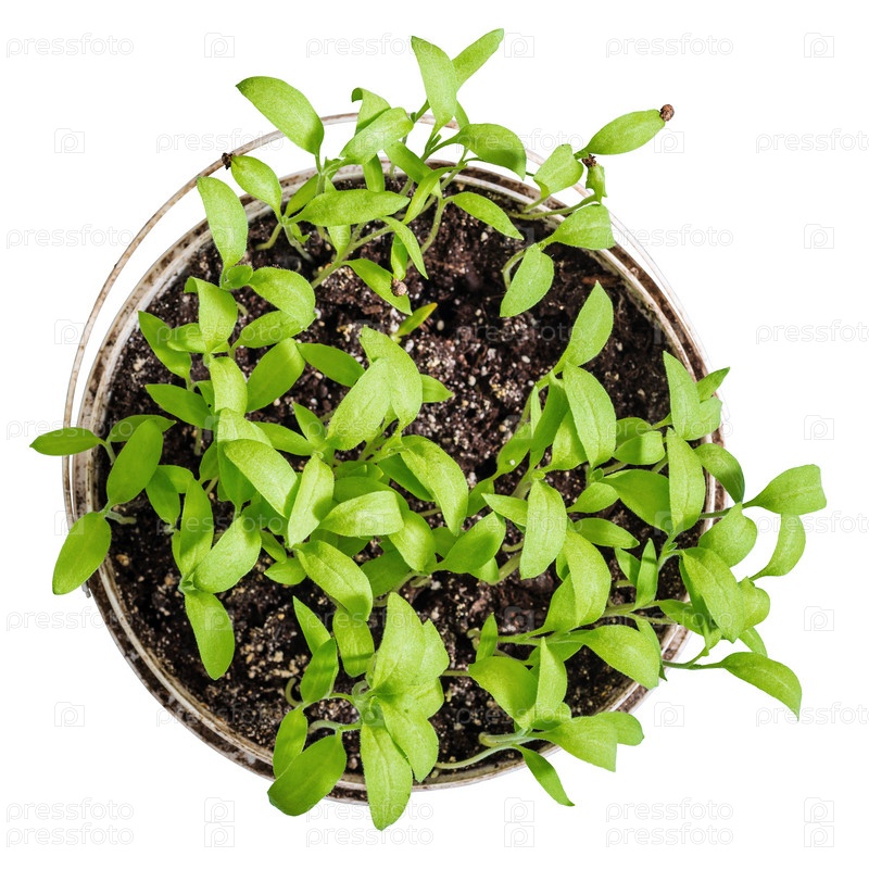Саженцы баклажанов в пластиковом ведре с почвой, вид сверху. Изолированные на белом фоне