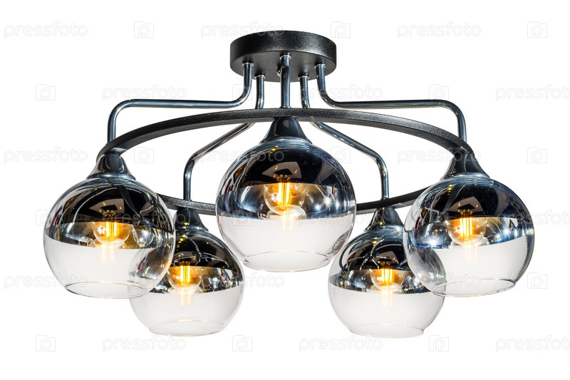 Потолочный пятиламповый светильник со стеклянными зеркальными плафонами. Изолированные на белом фоне