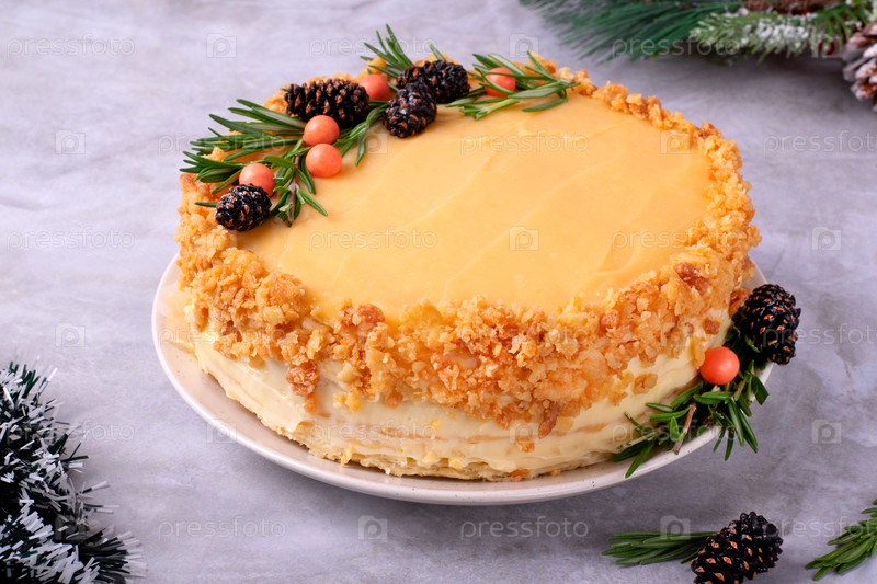 Рубленый торт с лимонным курдом и масляным кремом, украшенный засахаренными сосновыми шишками, розмарином и сахарной посыпкой