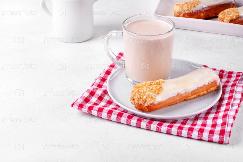 Чашка кофе с молоком и эклер с глазурью на белом столе. Французский десерт с заварной начинкой, подается с горячим напитком. Копировать пространство