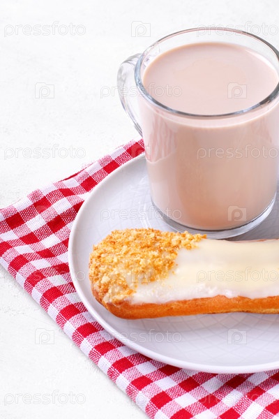 Чашка кофе с молоком и эклер с белой глазурью, французский десерт с заварным кремом