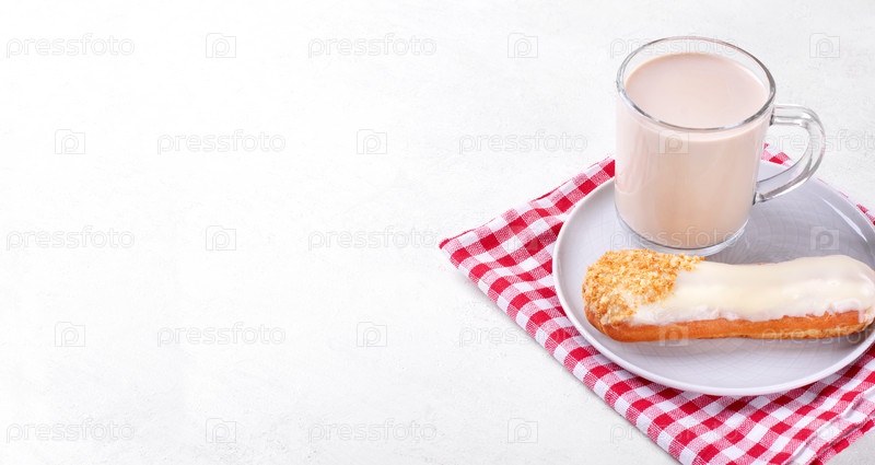 Чашка кофе с молоком и эклер с глазурью на белом столе. Французский десерт с заварной начинкой, подается с горячим напитком. Копировать пространство