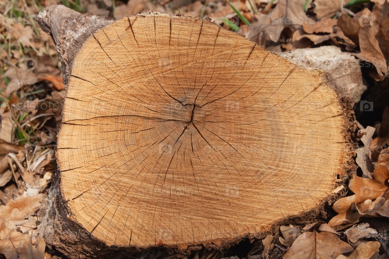 Пень среди осенних листьев и травы. Вид сверху на кольца и трещины на нем