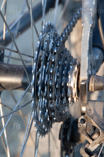 Крупный план кассеты и цепи горного велосипеда. Элемент велосипедной трансмиссии