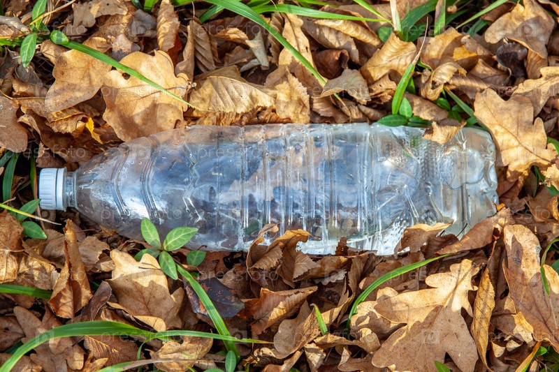 Пластиковая бутылка с водой лежит в лесу среди листьев и травы