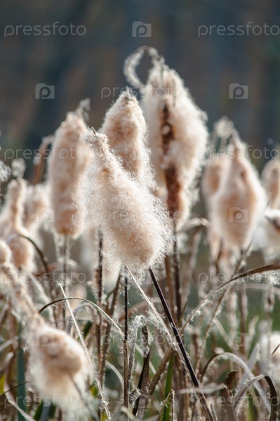 Пушистые семена рогоза. Прибрежная растительность у озера