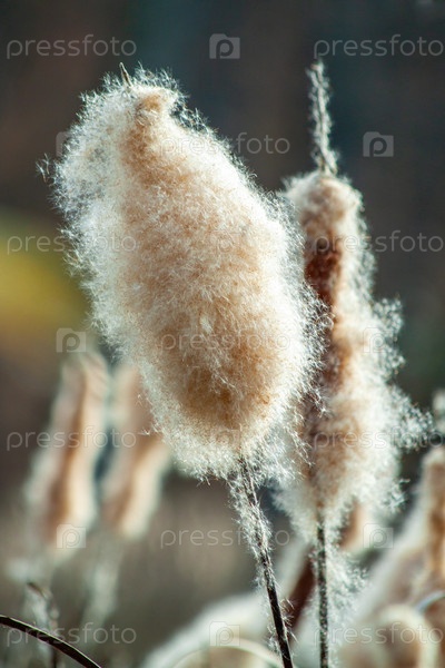 Семена пушистого рогоза крупным планом. Прибрежная растительность у озера