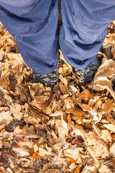 Ноги в спортивных штанах и кроссовках стоят в осенней листве