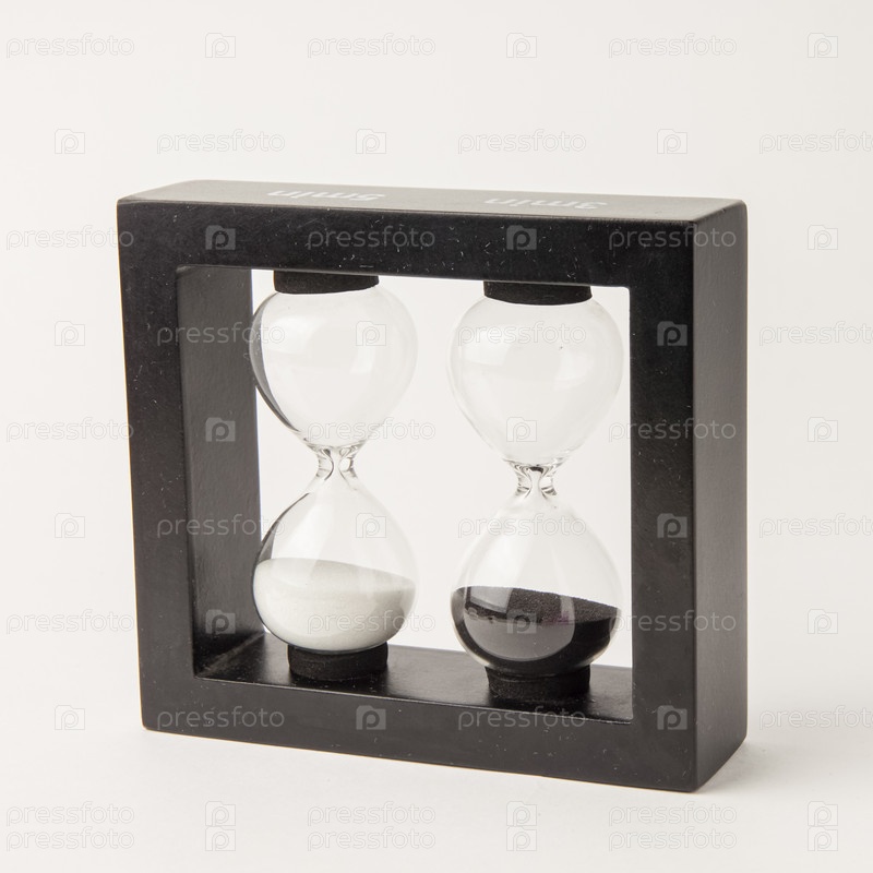 Песочные часы в деревянном корпусе с белым и черным песком. Время доклада 3 и 5 минут. Отдельный на белом фоне