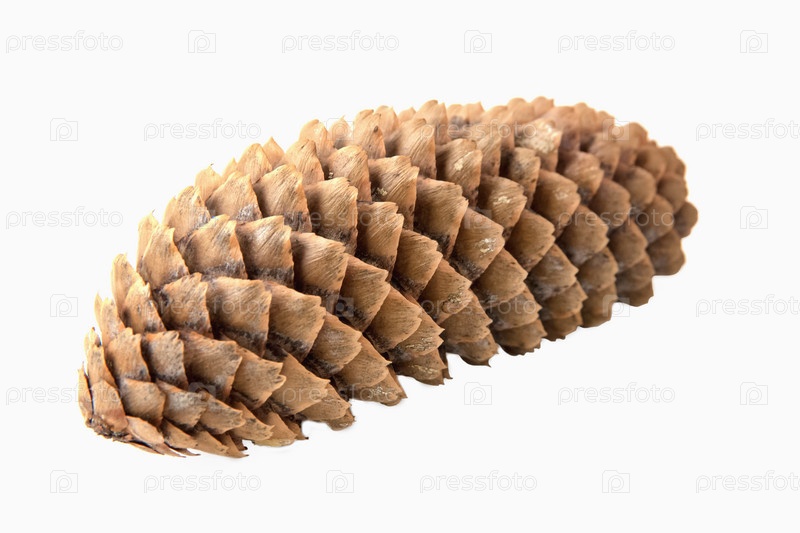 Длинная сушка еловой шишки на белом фоне