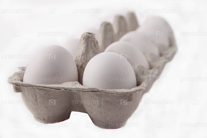 Коробка белых куриных яиц, изолированные на белом фоне. 10 кусочков