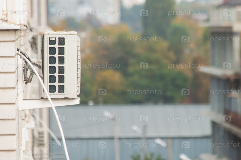 Компрессорная установка сплит-системы на стену многоэтажного дома. Вид сбоку