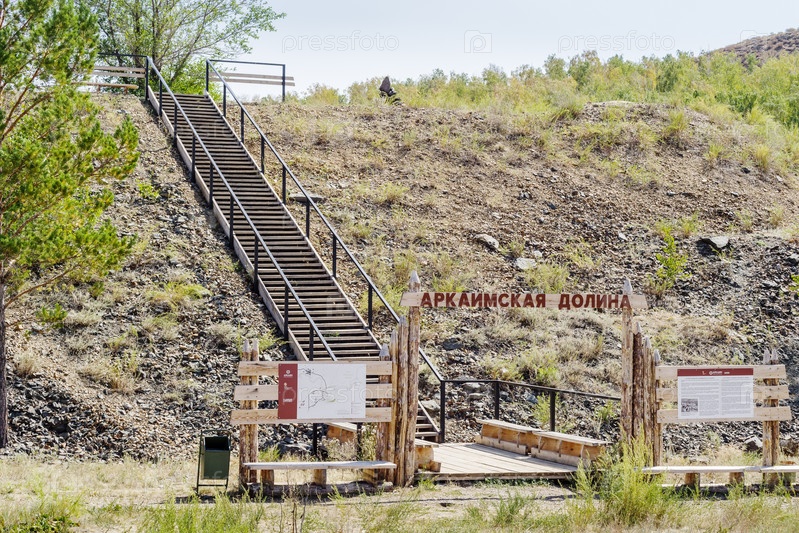 Аркаим, Челябинская область, Россия - 24 августа 2021 г.: Ворота с надписью: Аркаимская долина