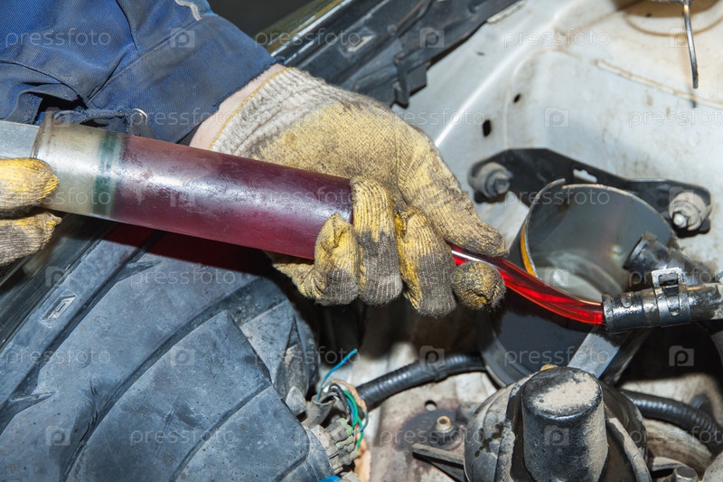 В руках механика в перчатках находится шприц с красным маслом. Замена жидкости в системе ГУР автомобиля
