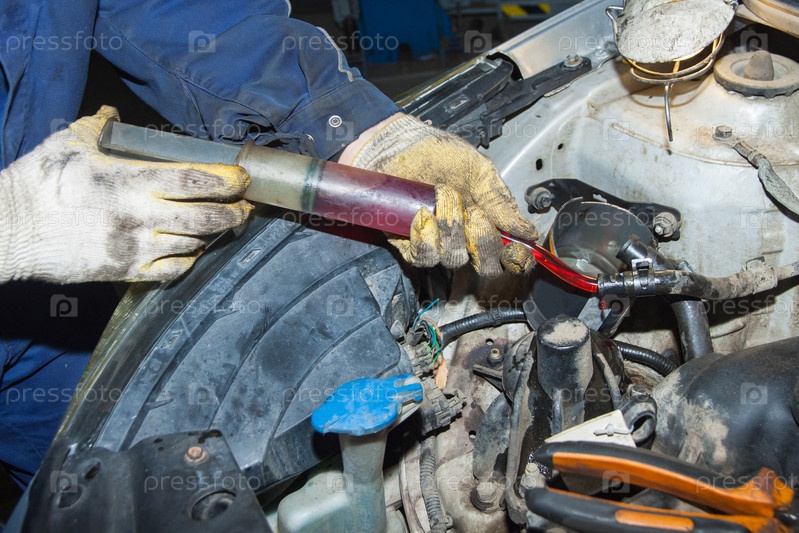 В руках механика в перчатках находится шприц с красным маслом. Замена жидкости в системе ГУР автомобиля