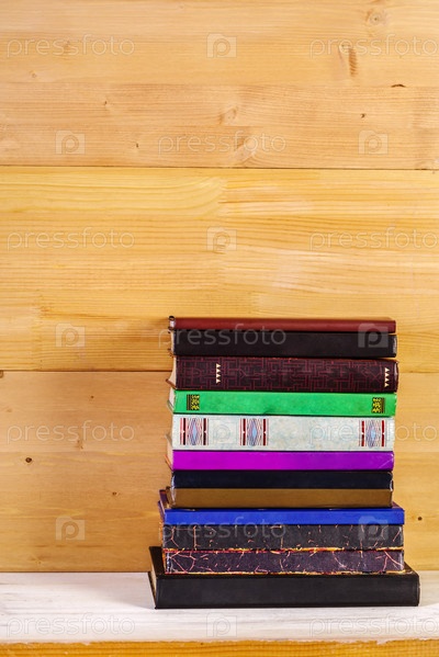 Стопка старых книг на деревянной полке