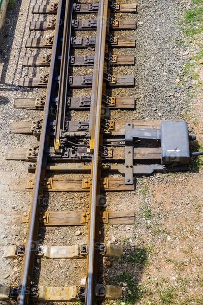 Железнодорожные пути со стрелкой. Рельсы на деревянных шпалах, вид сверху