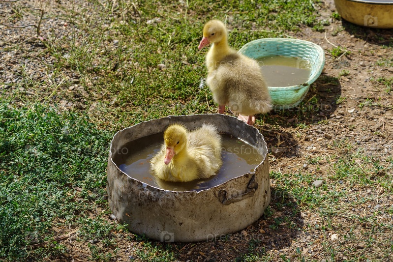 Гусята в летний день во дворе сельского дома. Подсобное хозяйство