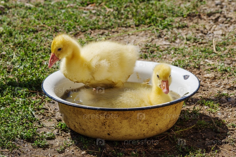 Гусята в летний день во дворе сельского дома. Подсобное хозяйство