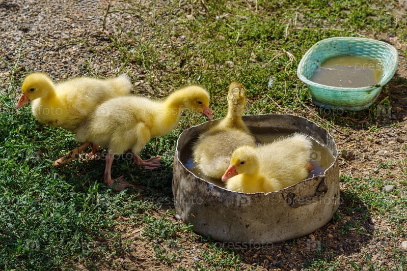 Гусята в летний день во дворе сельского дома. Подсобное хозяйство