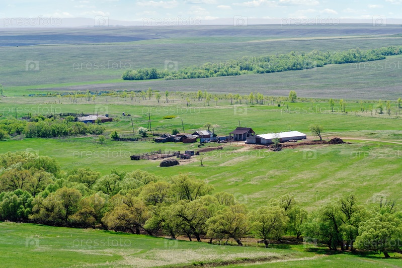Сельскохозяйственная ферма среди весенних полей. Фото сделано возле села Воскресеновка, Оренбургская область, Россия