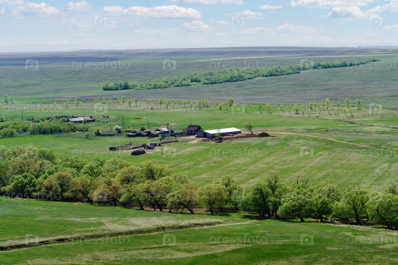 Сельскохозяйственная ферма среди весенних полей. Фото сделано возле села Воскресеновка, Оренбургская область, Россия