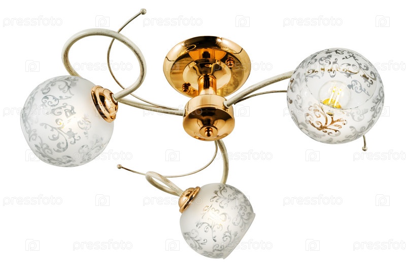 Люстра трехламповая с плафонами из матового стекла с цветочным узором. Изолированные на белом фоне
