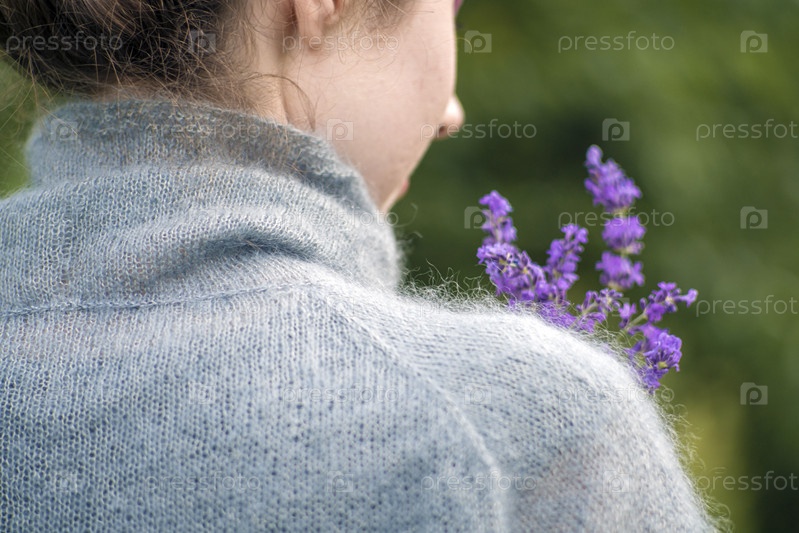 Красивая женщина в сером прозрачном ангорском свитере держит в руках цветы лаванды