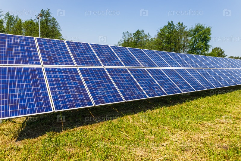 Солнечные батареи на фоне неба. Солнечная электростанция. Альтернативный источник электричества