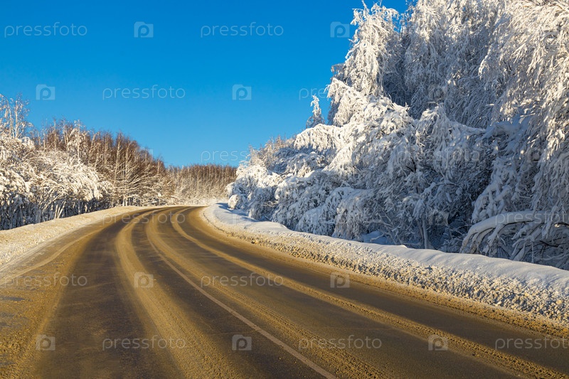 Проселочная дорога в заснеженном лесу в тайге в зимний день. красивый пейзаж зимнего хвойного леса