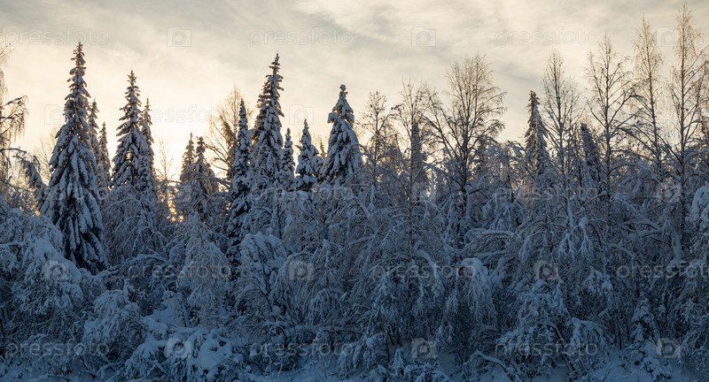 Заснеженный лес в тайге в зимний день. красивый пейзаж зимнего хвойного леса. заснеженные ели